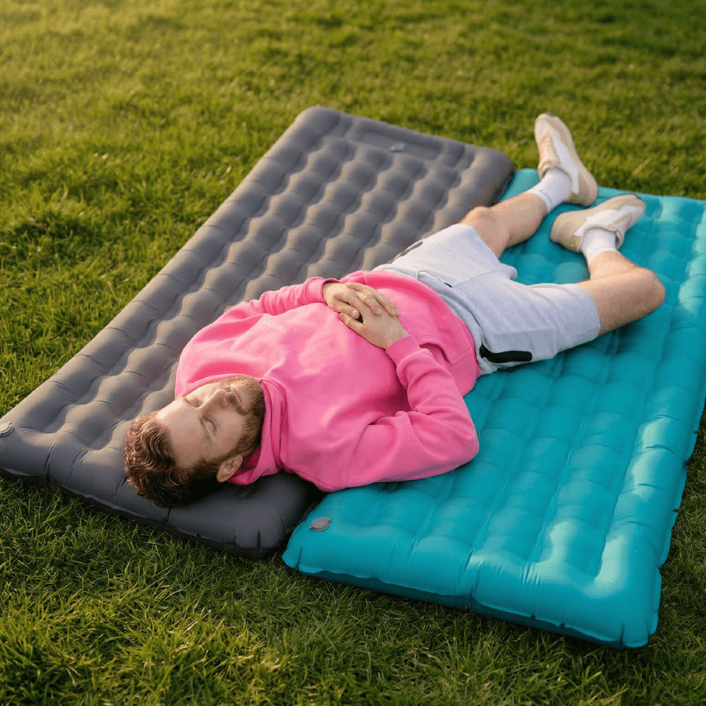 Weil diese Matratze komplett flach ist, entsteht beim Zusammenklippen über die seitlichen Druckknöpfe eine riesige, durchgehend ebene Fläche. Keine nervigen Ritzen oder Wölbungen, in die man reinrutscht – das perfekte nahtlose Doppelbett für Paare oder die ultimative Chill-Area für die ganze Familie.